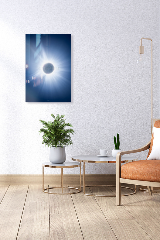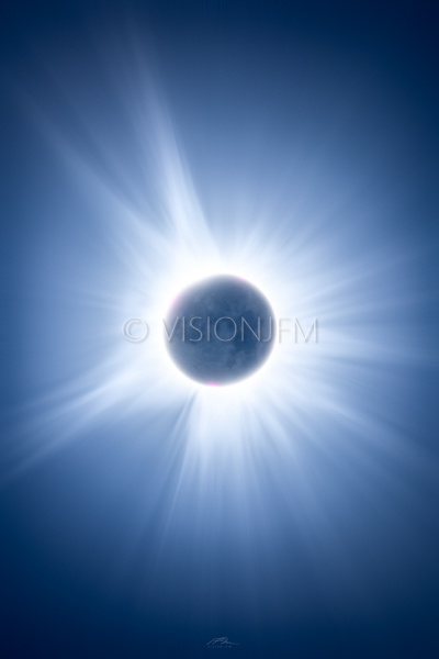 Le moment du Couronnement surgit lorsque la lumière forme une couronne éclatante, enveloppant la Lune d’un halo bleu profond. L’éclipse atteint ici son apogée, faisant rayonner les filaments de la couronne solaire tel un diadème céleste.